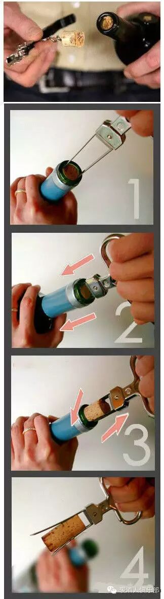 对于陈年太久的腐烂木塞或因保存不当而干裂、破碎的酒塞,应采用双铁片式开瓶器进行拔取。使用方法如下图: