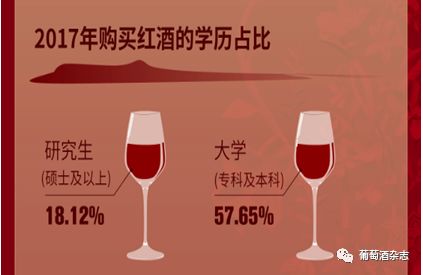 京东公布的2017年葡萄酒销售数据表明,消费人群中57.65%的是大学(专科及本科)毕业,研究生(硕士及以上)学历为18.12%。看似相差较大,但由于在整个社会中,大学毕业人数远远高于研究生,例如2017年应届毕业大学生795万,应届毕业研究生55.2万人。按照整体学历和人群的比例而言,研究生学历更倾向于购买葡萄酒。两者加起来,超过了总消费人群的四分之三,仅从学历这个变量来说,足以说明,高学历更加追求高品质生活,有能力为更好的生活买单。同时,这与他们能够接触到更丰富、更加多样的生活方式也相关。